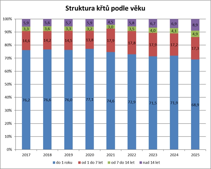 Podíl pokřtěných dětí do jednoho roku věku na počtu narozených zůstal v roce 2025 stejný jako v předchozím roce (12,1 %). Trend odkládání křtu do vyššího věku, který se výrazněji projevil během pandemie covidu, přetrvává i nadále – více než šestinu všech křtů tak tvoří děti ve věku 1–7 let.